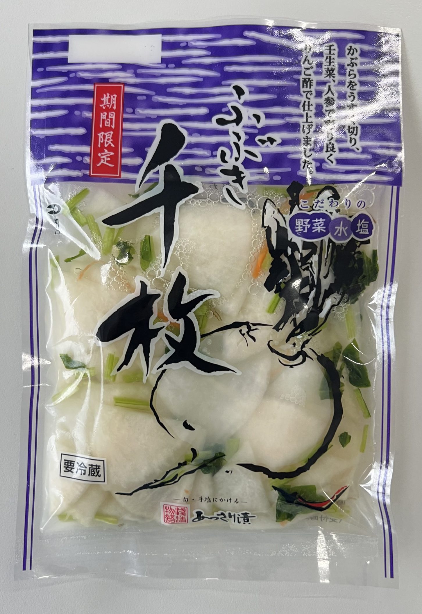 冬の風物詩!千枚漬け。寒さで甘味ののったかぶを贅沢に厚く皮むきした後にうすく切り、壬生菜、人参、糸昆布で彩りよくりんご酢で仕上げました。りんご酢の香り高い風味と甘さがとてもマッチしており、切れているので、そのままお皿に盛り付けすぐに食べて頂ける、欲張りな千枚漬けです。ご飯はもちろん、お茶うけにもとてもよく合います。