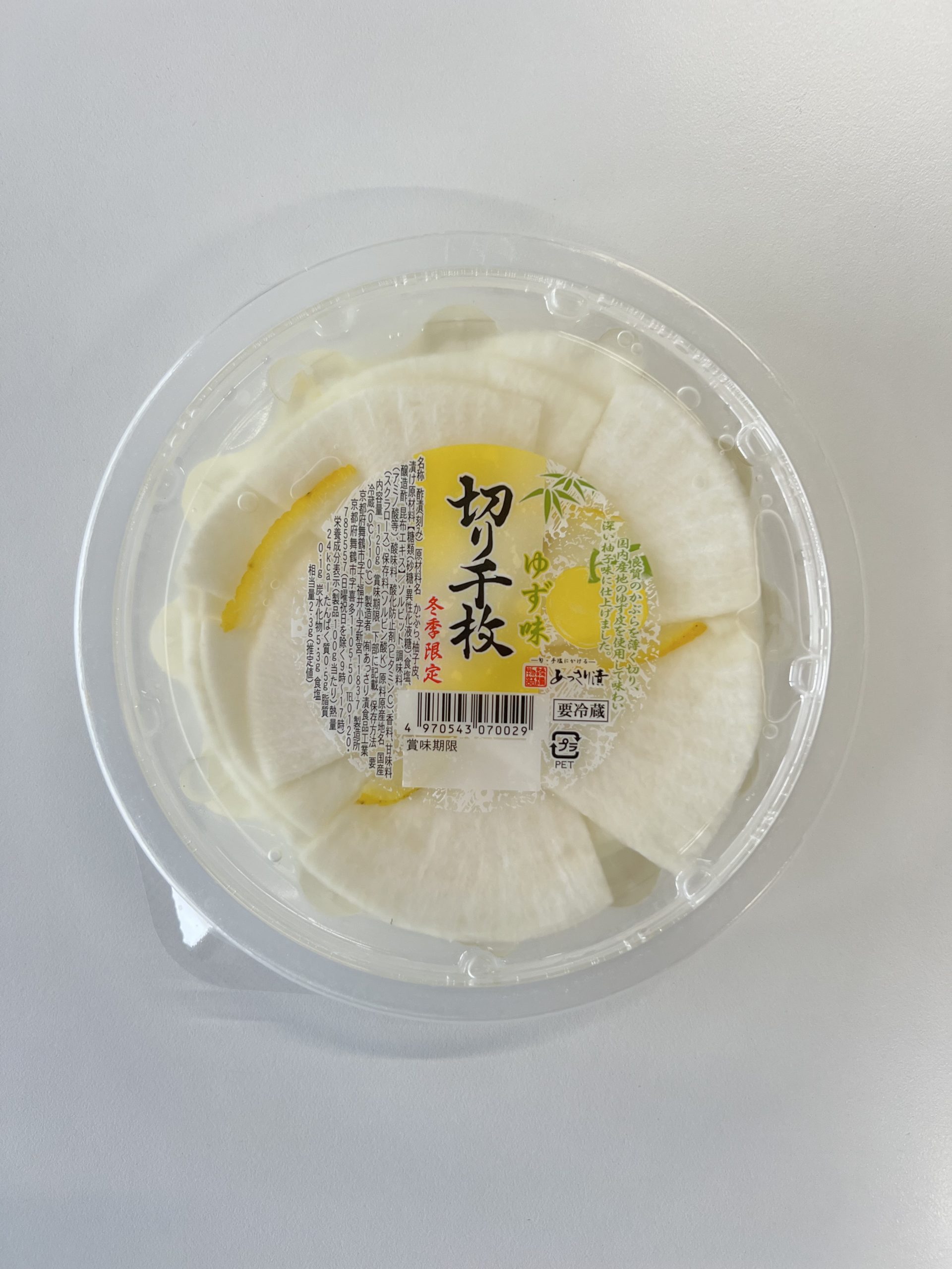 冬季限定商品。冬に旬を迎える聖護院かぶらを薄く切り、醸造酢で仕上げた上品な味わいを楽しんでいただけます。ゆずの風味香る甘酢仕立ての一品です。(例年11月~2月までの販売)